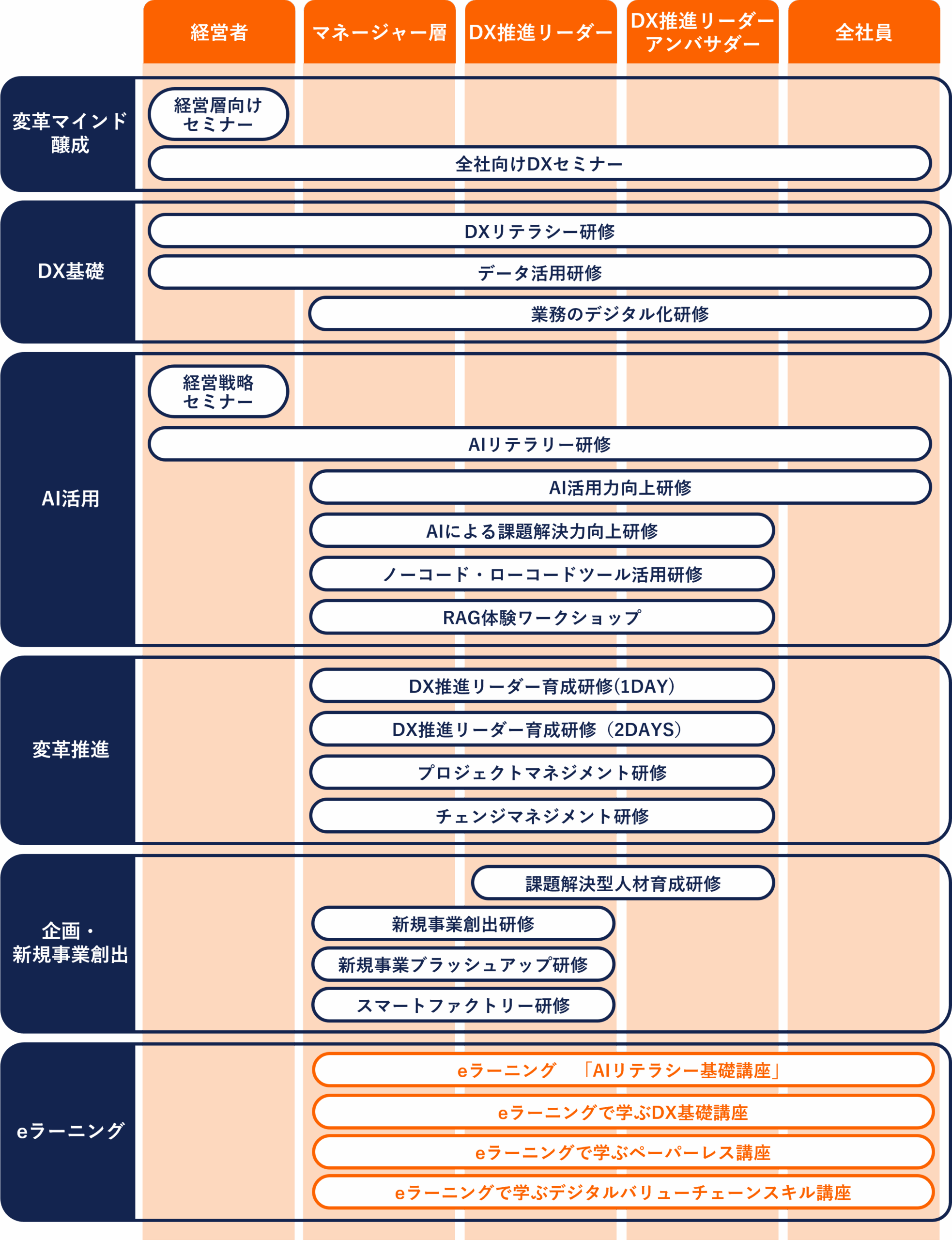 経験者から特定部門向けまで網羅した豊富なDX研修カリキュラムを用意。